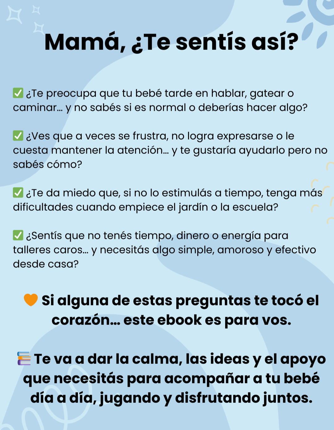 A todas las mamás y papás que quieren acompañar el crecimiento de su bebé con amor, juegos y conexión, desde los primeros meses hasta los 5 años.